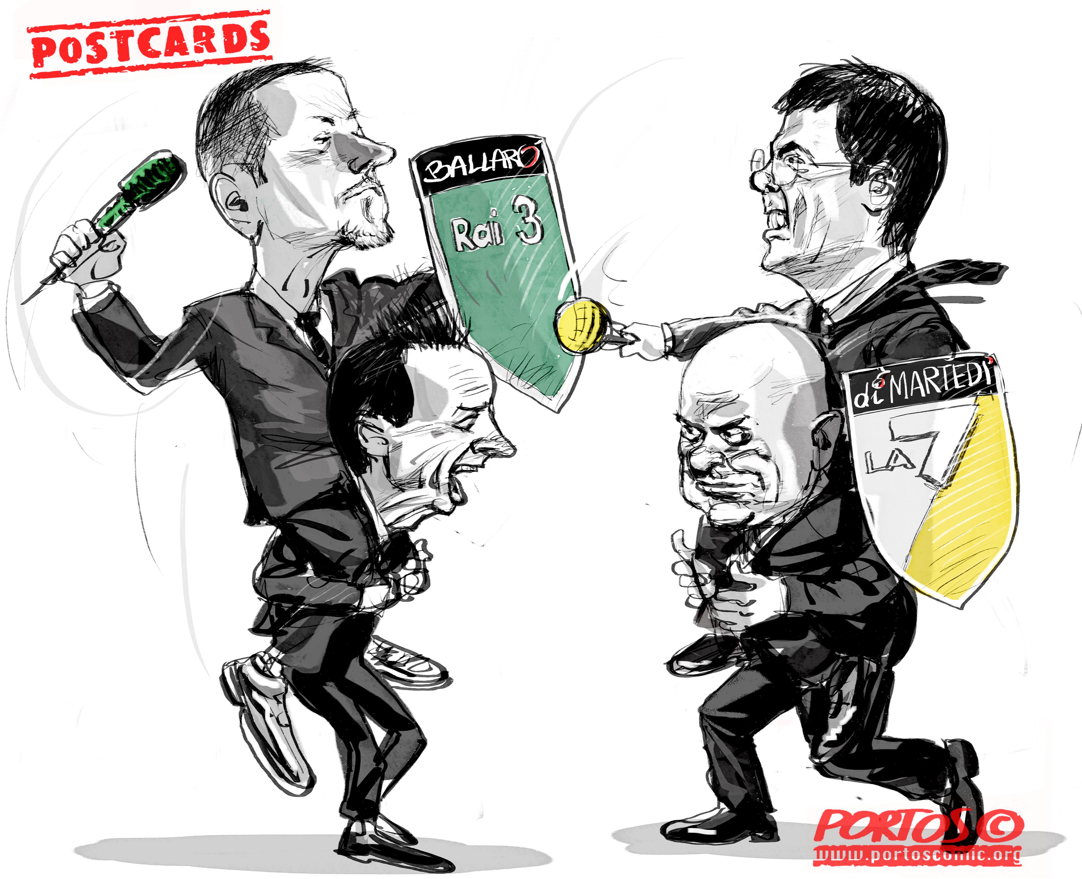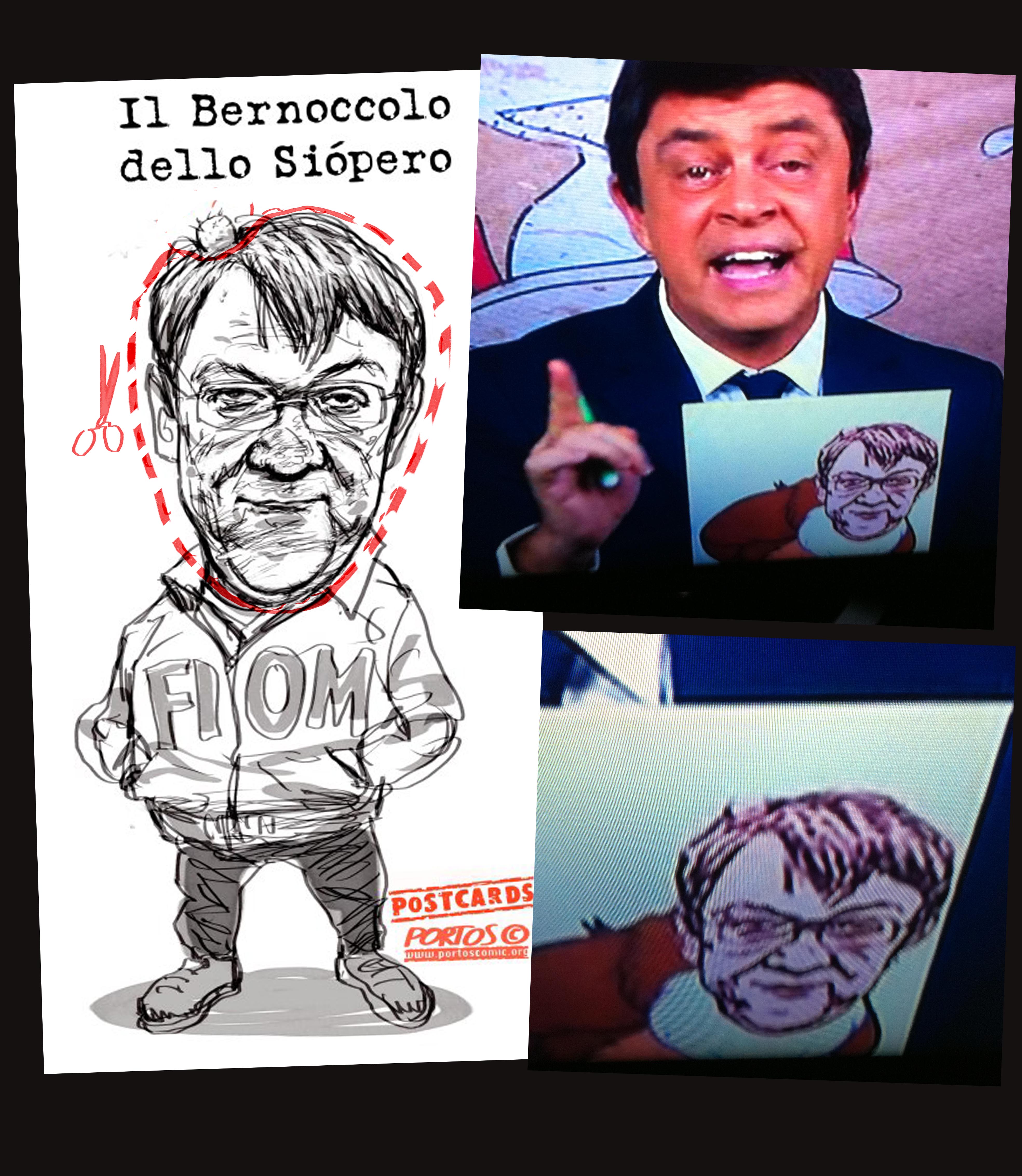FURTO! Su LA7,a “Di Martedìdi”di Floris, stasera, vedo con sommo stupore che gli autori del programma mi hanno RUBATO una vignetta “opportunamente” mutilata del suo significato e della mia firma. Nessuno mi ha interpellato come già avvenuto in passato con “Z” di Gad Lerner. Questo malcostume continua a danno di noi autori da destra e sinistra. Oggi ho segnalato per la seconda volta a Libero Quotidiano.it che non possono tagliare-copiare-incollare a piacimento e gratis l’opera altrui. Intanto godetevi l’istantanea di Crozza che maneggia un cartoncino con una illustrazione RUBATA. Potete anche vedere “l’asportazione ” grossolana del bernoccolo dello Siopero sulla testa del MIO Landini!